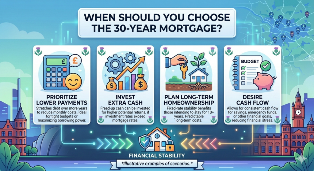 If you plan to stay in your home long-term without specific relocation plans, the 30-year mortgage makes sense. The psychological security often outweighs the mathematical disadvantage of higher total interest.